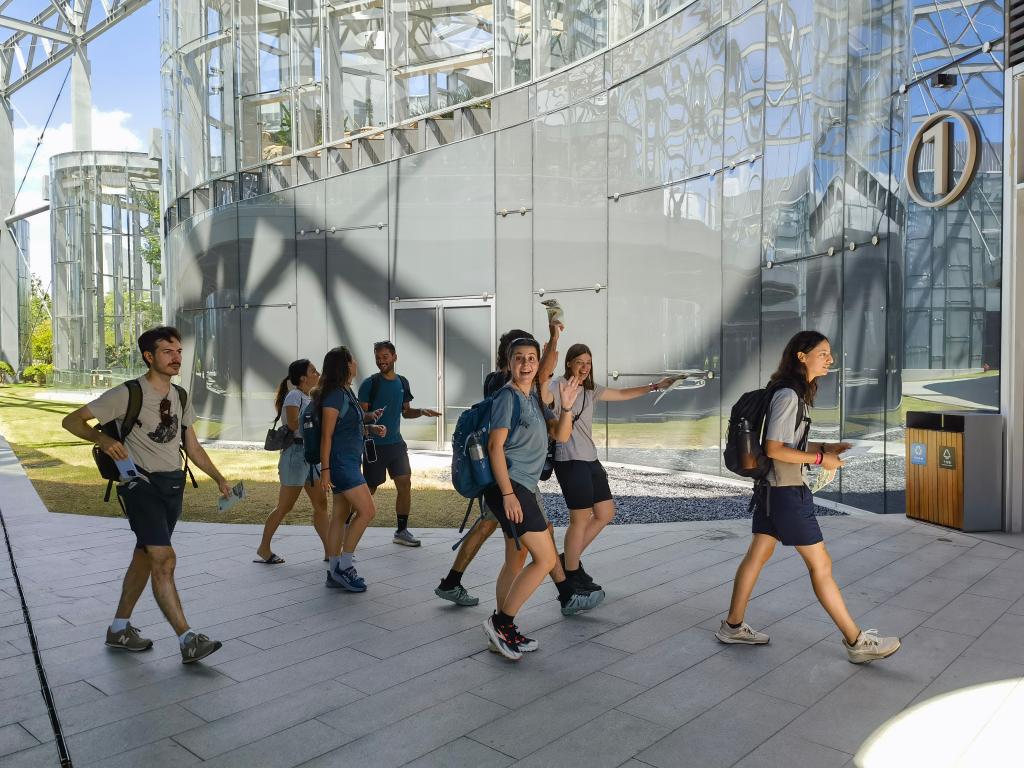 8月15日,一群外国游客在位于上海世博文化公园的上海温室花园游览。